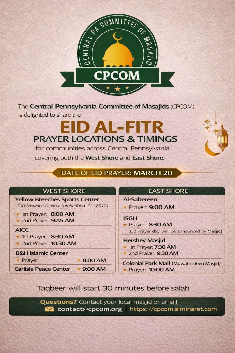 The Central Pennsylvania Committee of Masajids (CPCOM) is delighted to share the EID AL-FITR PRAYER LOCATIONS & TIMINGS for communities across Central Pennsylvania, covering both the West Shore and East Shore.